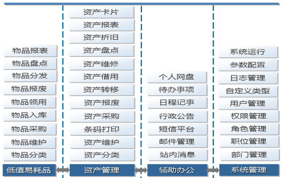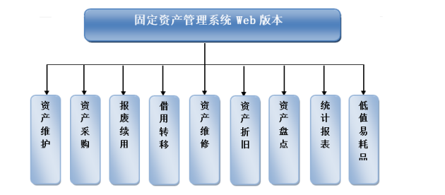 本系统主要围绕企业的固定资产及低值易耗品的日常管理工作,功能??榘ㄗ什ǖ?、采购管理、条码打印、报废/续用管理、转移管理、借用管理、维修管理、盘点管理、 折旧管理、入库管理、领用管理、分发管理、行政公告、短信平台、系统管理等功能。系统配置如下图: