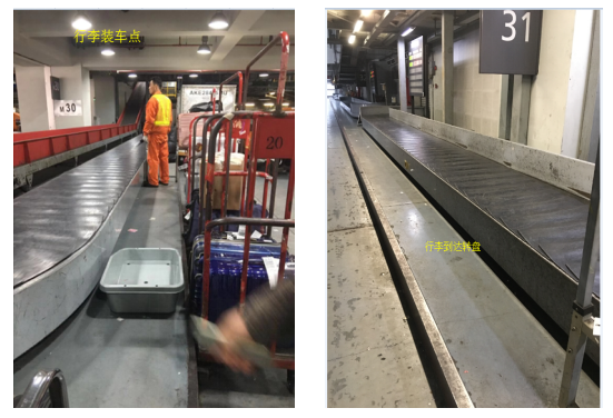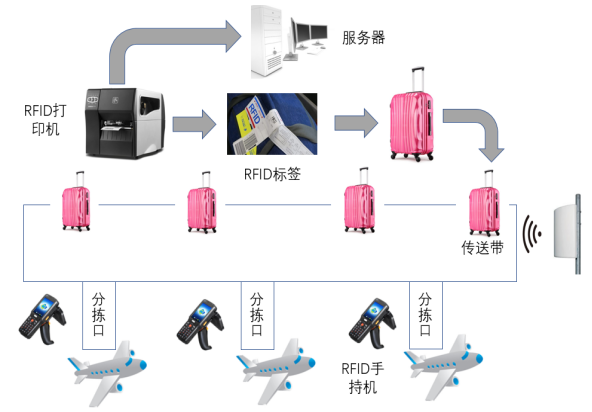 从机场出发的旅客在出发值机柜台办理行李托运,工作人员根据旅客登机牌完成托运登记并打印RFID行李标签,将RFID行李标签安装在行李上后放入行李输送机。输送机安装有RFID采集通道,当行李通过RFID采集通道时,其相关信息即被采集并上传给输送机控制系统,输送机控制系统根据得到的信息即可将行李正确的分拣到对应航班的行李房格口槽。最后搬运工将对应航班的行李转送到行李箱,同牵引车上飞机货舱。