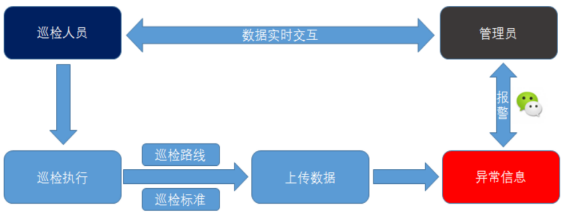 巡检人员持RFID手持终端按照巡检路线及巡检标准,准确地采集相应指标的数据,上传数据到云端,系统根据巡检结果,生成巡检报告,同时将有异常的巡检点信息通过微信发送给相关人员,相关人员根据实际情况及时做相对应的处理。
