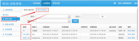 用户路线: 巡检路线的分配,点击“路线分配”,进入路线分配界面,选择工作人员(“用户管理”选项中添加的用户) ,选择路线(“路线管理”中添加的巡检区/点) ,将巡检人员和巡检区域/点分配好,相关人员只有经过分配给自己的区域时,才能读取该区域的 RFID 标签/被该区域的 RFID 读写设备读取; 经过不属于自己的区域,将无法读取该区域的 RFID 标签/被该区域的 RFID 读写设备读取;如需允许巡检人员能够读取多个区域的 RFID 标签/被多个区域的 RFID 读写设备读取,只需在“用户路线”中对同一个巡检人员“添加” 多个区域/点的安防巡检,多建几个巡检路线;