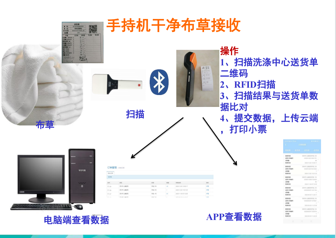 基于RFID技术,对布草的送洗、交接、出入库、自动分拣、库存盘点等各个作业环节的数据进行自动化数据采集,并通过睿丰厚德超高频手持终端读写器将采集数据实时上传至后台系统,实时掌握布草流转各个环节的状况,实时统计洗涤次数、洗涤费用以及租赁数量及租赁费用。实现洗涤管理全程可视化,为企业的科学管理提供实时的数据支持。