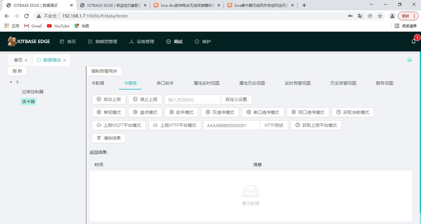 点开调试-数据调试,选择左边编号下读写器后,点卡服务,依次从下往上点击上报HTTP平台模式--常规模式--启动上报,即可在卡数据区看到当前上报的数据