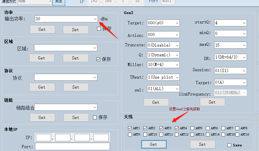 上电,网线连接到交换机网口或与读写器通过网线直连(需保证电脑IP同读写器IP在同一网段,读写器默认IP为192.168.1.168,端口16666)