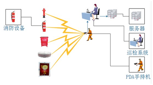 3.3、任务执行:每位巡检员配备一台RFID手持巡检终端,接收管理平台下发的巡检任务,依次对各消防设备扫描读取RFID电子标签并生成巡检记录,如发现设备损坏或不能正常启动,在手持终端上如实记录问题、解决方法、处理结果并保存巡检记录,通过wifi或移动网络实时将巡检记录上传到管理平台。