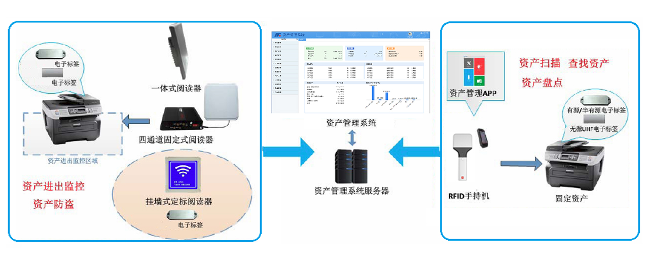 通过RFID+手持设备+门禁式 RFID 识别设备,在日常的资产管理中,实现快速和便利的资产管理应用。